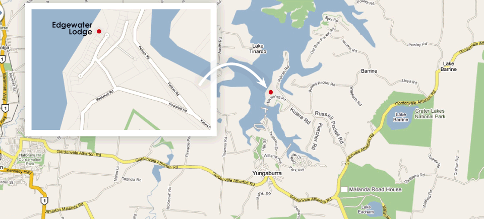 Coming from Kuranda via Atherton onto Yungaburra take the second turn to the left after the Township of Yungaburra which is Russell Pocket Road. Travel 3 km then turn left into Kulara Road. Travel a further 1 km and you will be greeted by the entrance to Edgewater. |